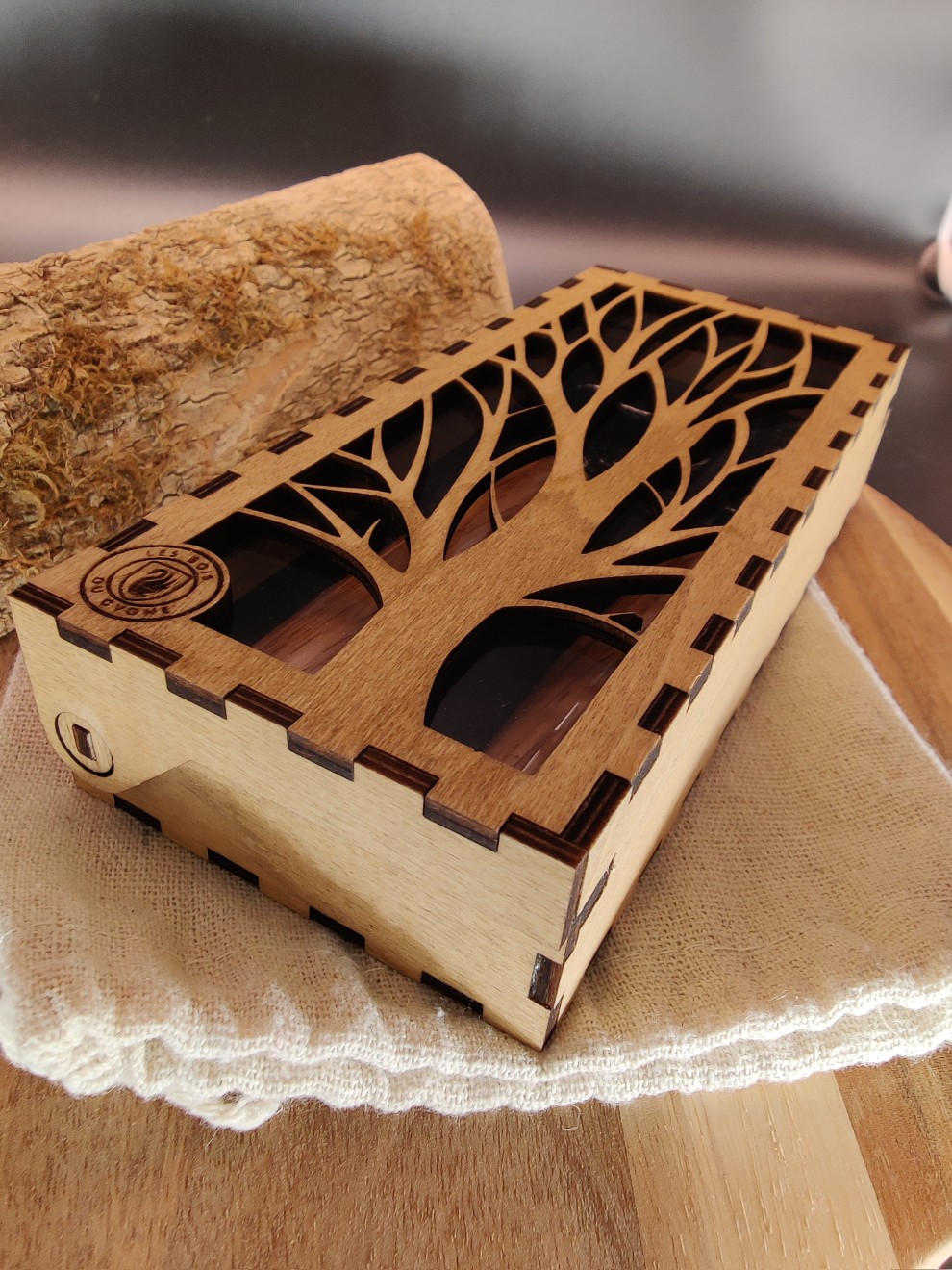 L'Écrin de prestige : Une boîte de présentation en bois, dont le couvercle est finement ajouré.
