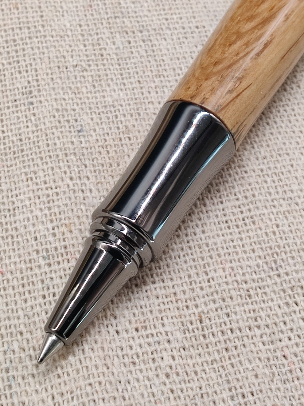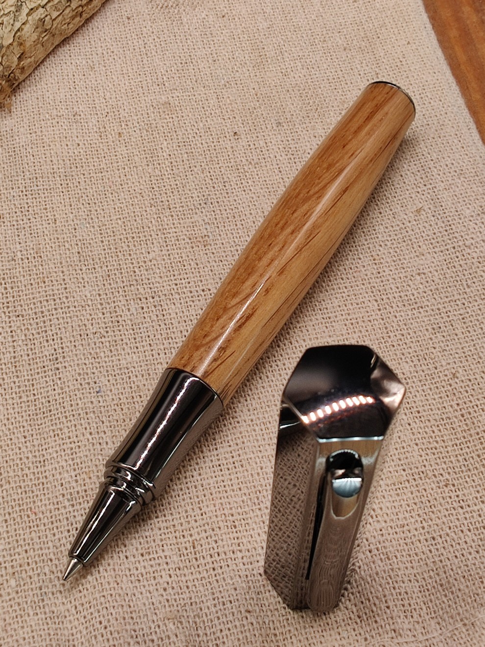 Le Stylo Roller "Le Pacte du Chêne" : Corps en chêne massif tourné à la main, équipé d'une mine roller haute fluidité.