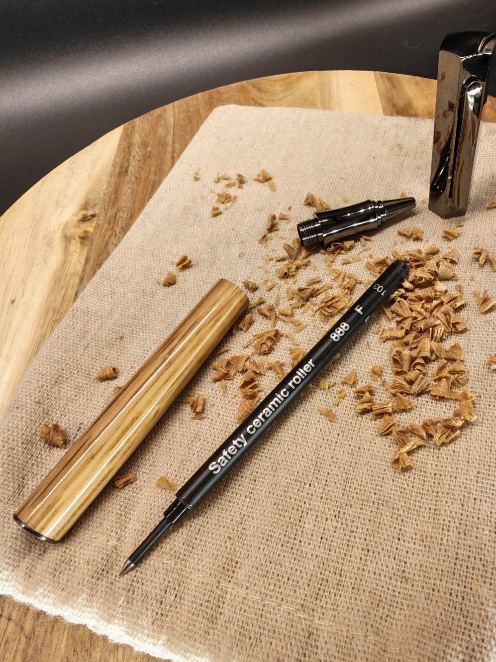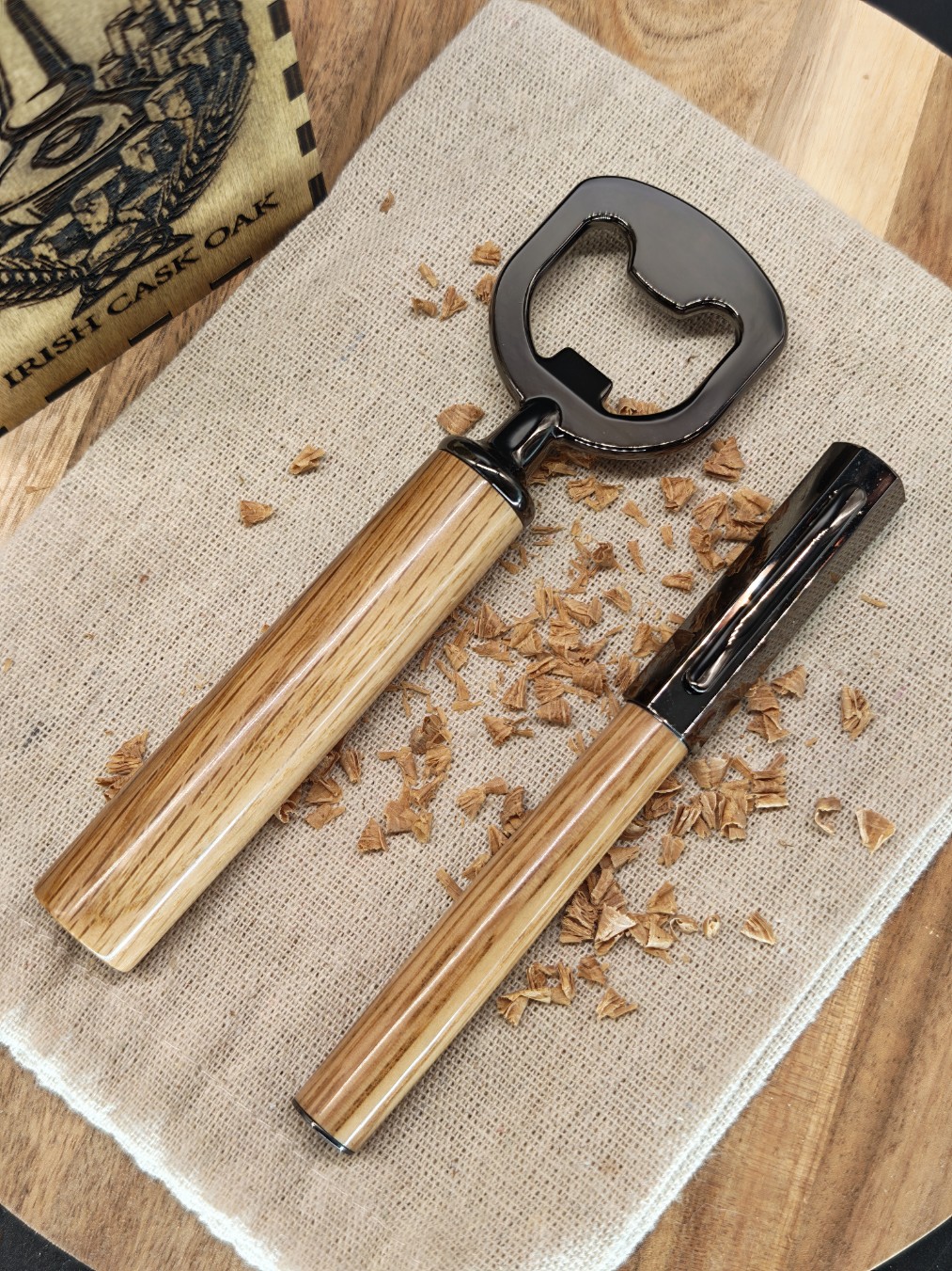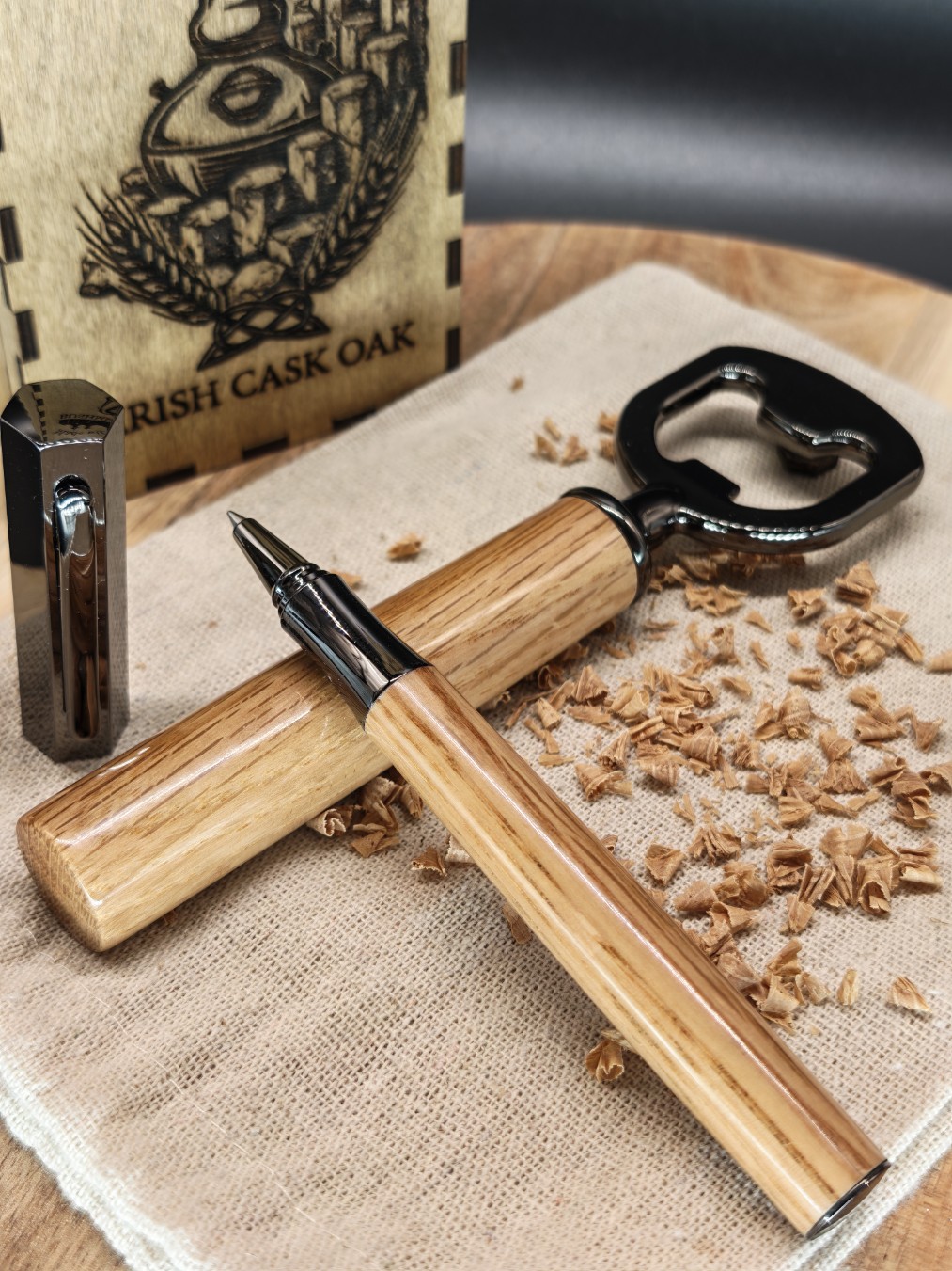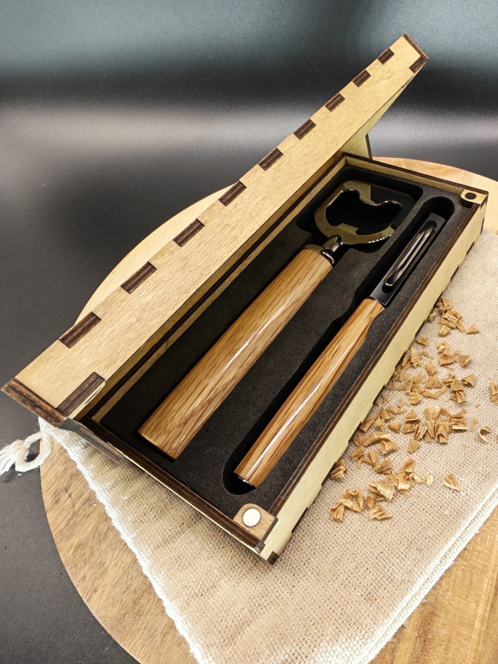 Ce coffret artisanal réunit un stylo roller à l'écriture fluide et un décapsuleur robuste, tous deux tournés à la main dans mon atelier.