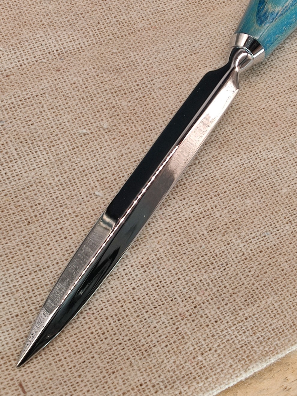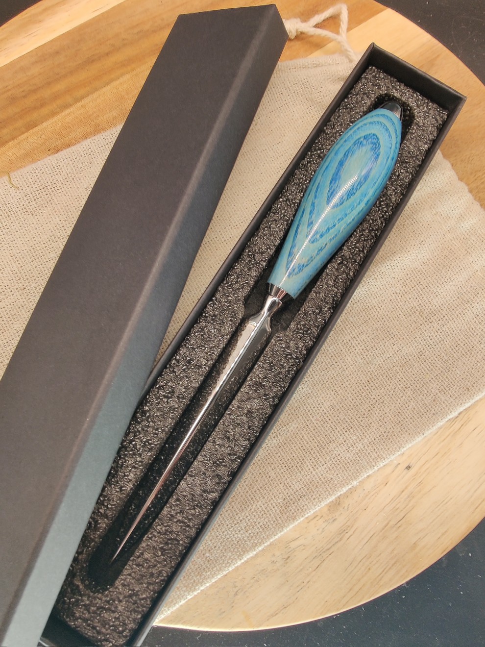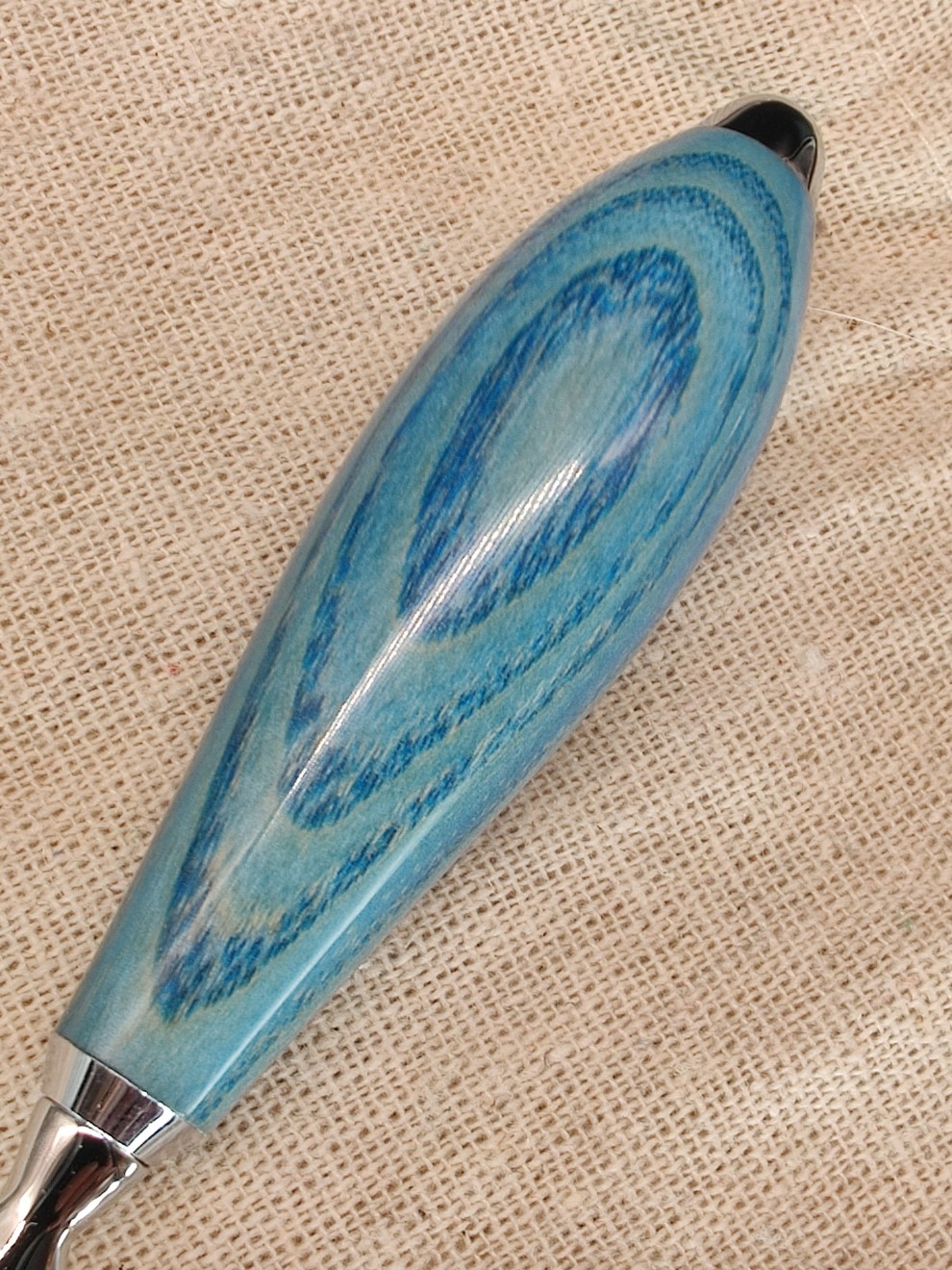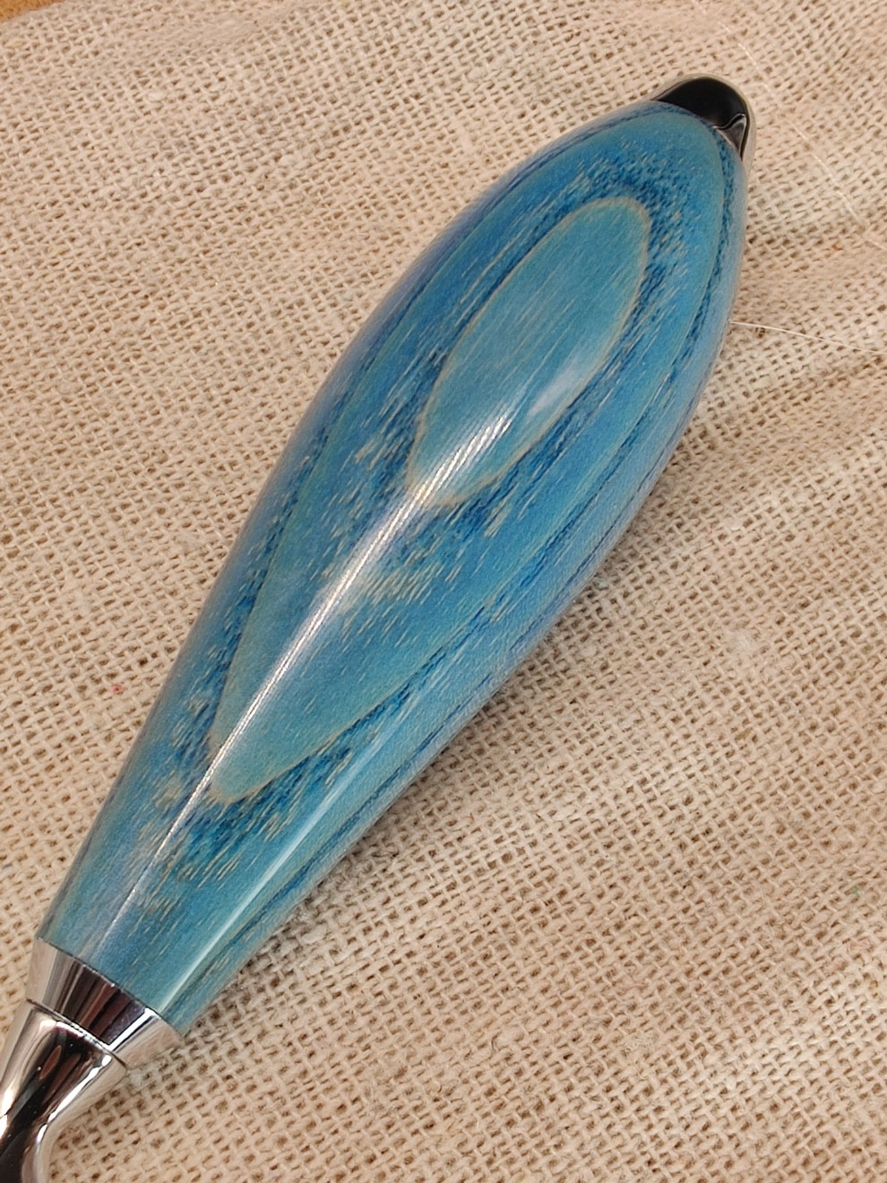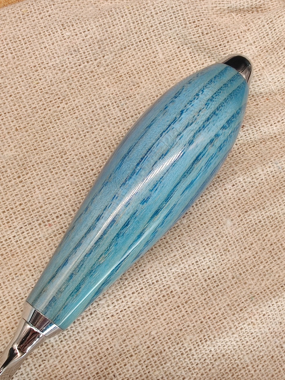 Avec "Le Lagon de Charme", j'ai voulu marier la noblesse du bois à la magie de la couleur. Pour cette pièce unique, j'ai choisi une essence qui m'est chère : le bois de Charme. Mais pas n'importe lequel. Ici, le bois a subi un procédé de stabilisation. Imaginez : la sève a été remplacée par une résine teintée, aspirée au cœur même des fibres. Le résultat ? Un bois "immortel", insensible à l'humidité, plus dense, et surtout, traversé par cette incroyable couleur bleu profond.