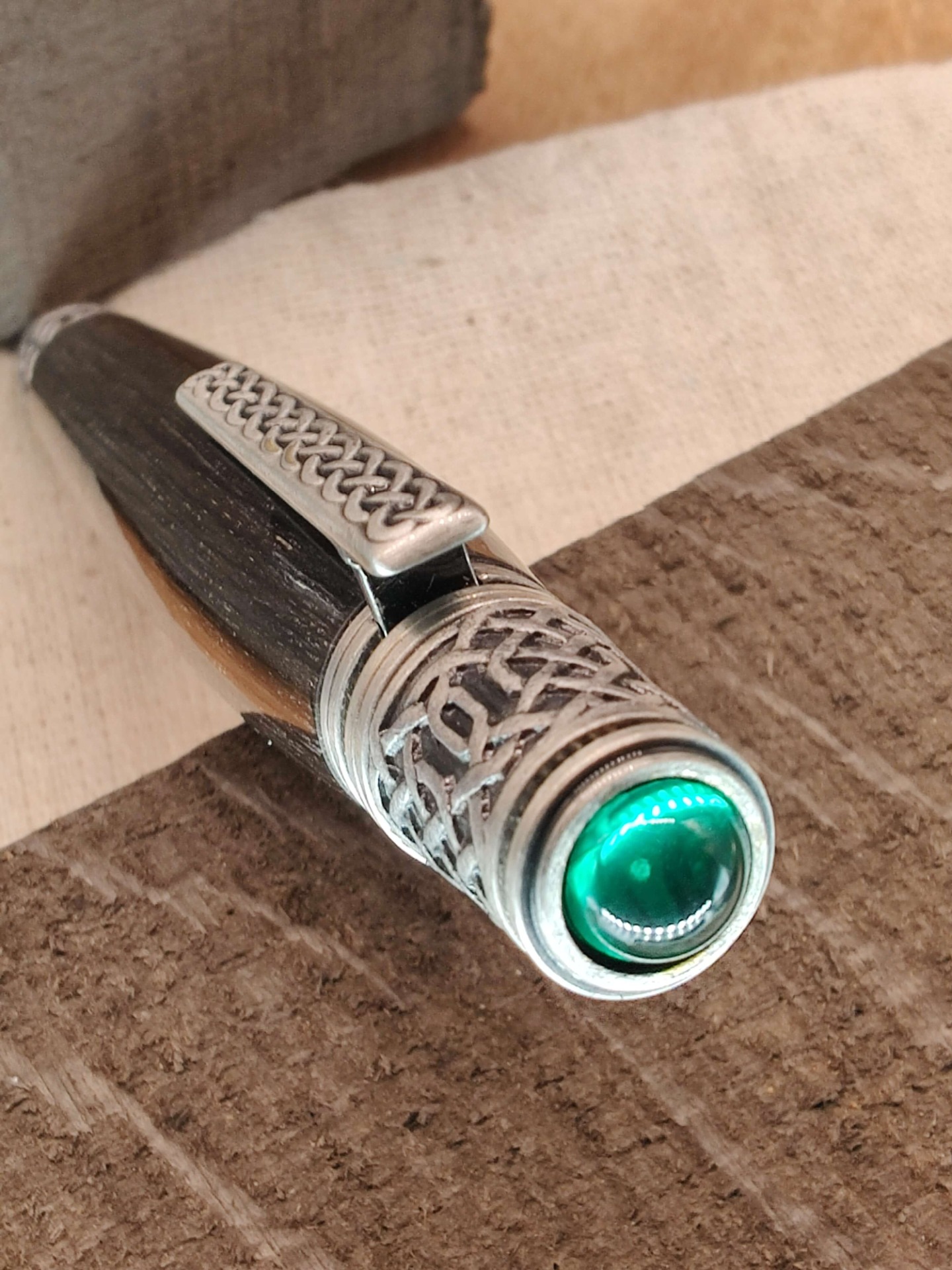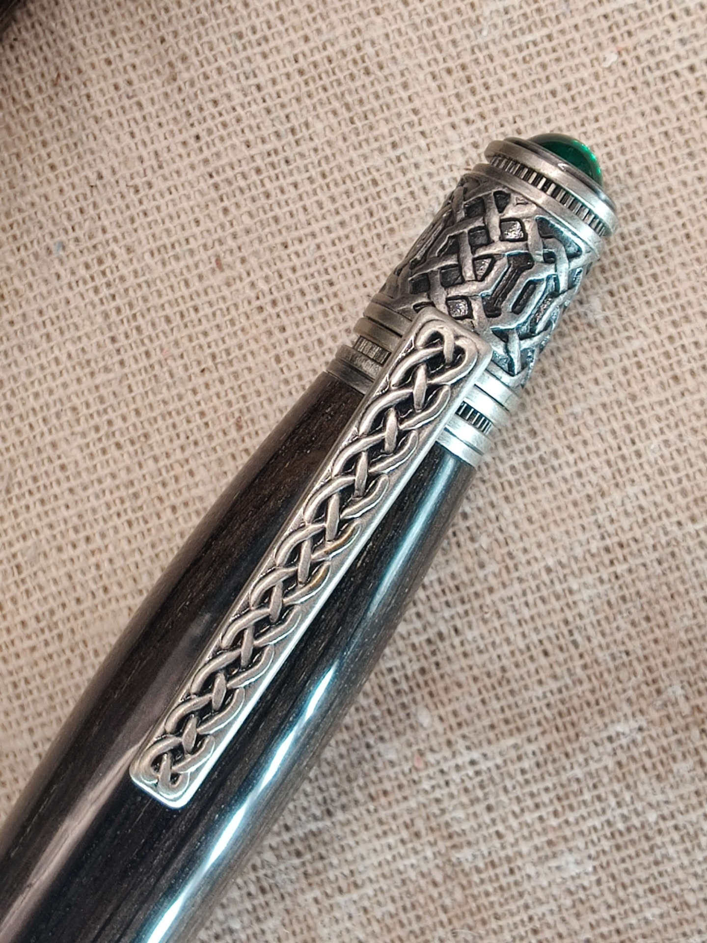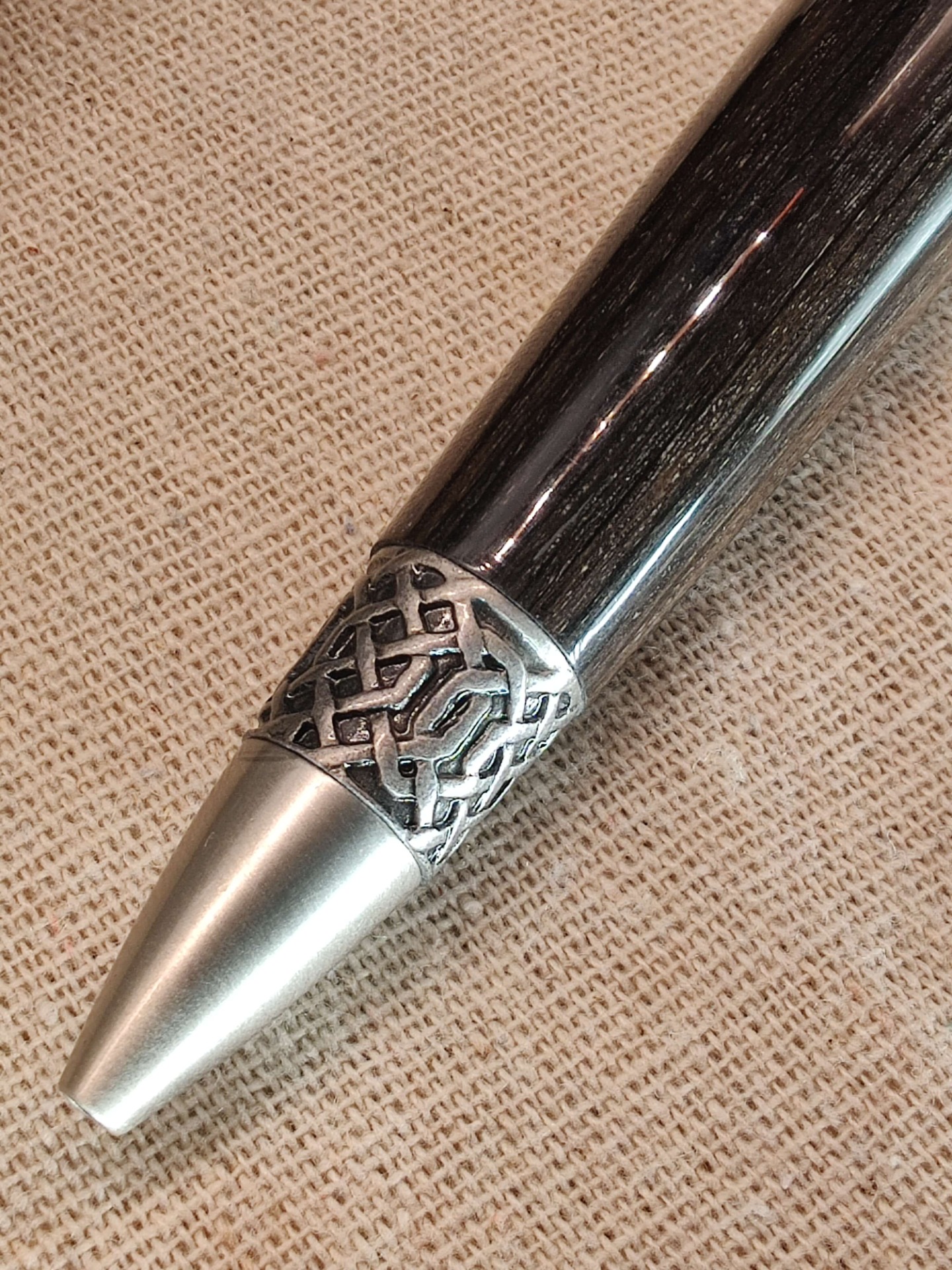 Le stylo est orné de nœuds celtiques sur la pointe, l'agrafe et l'extrémité.