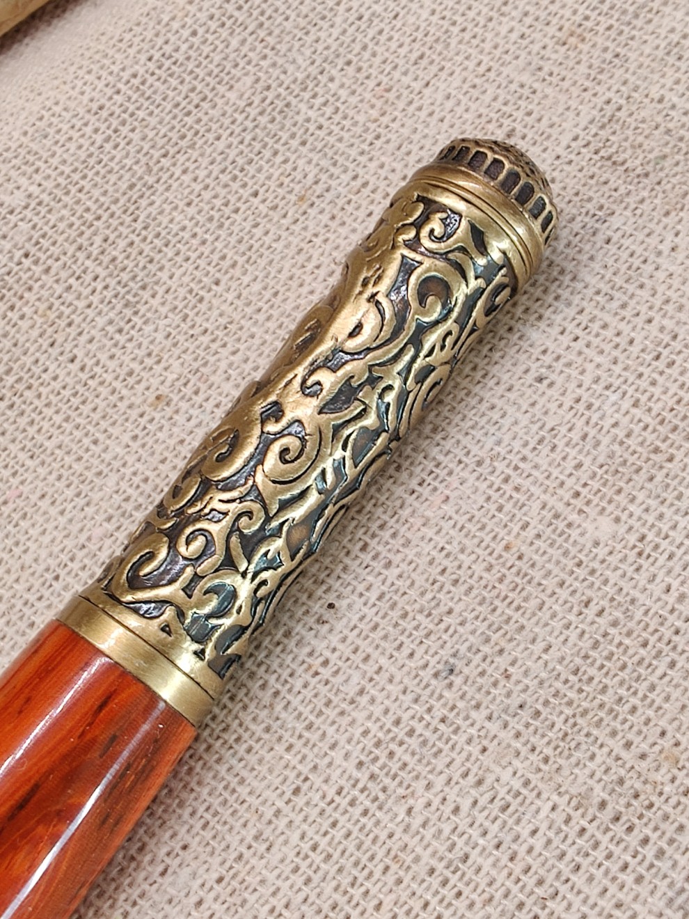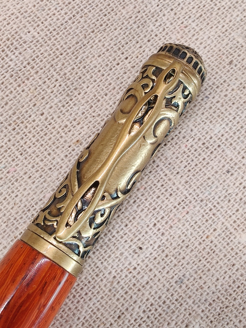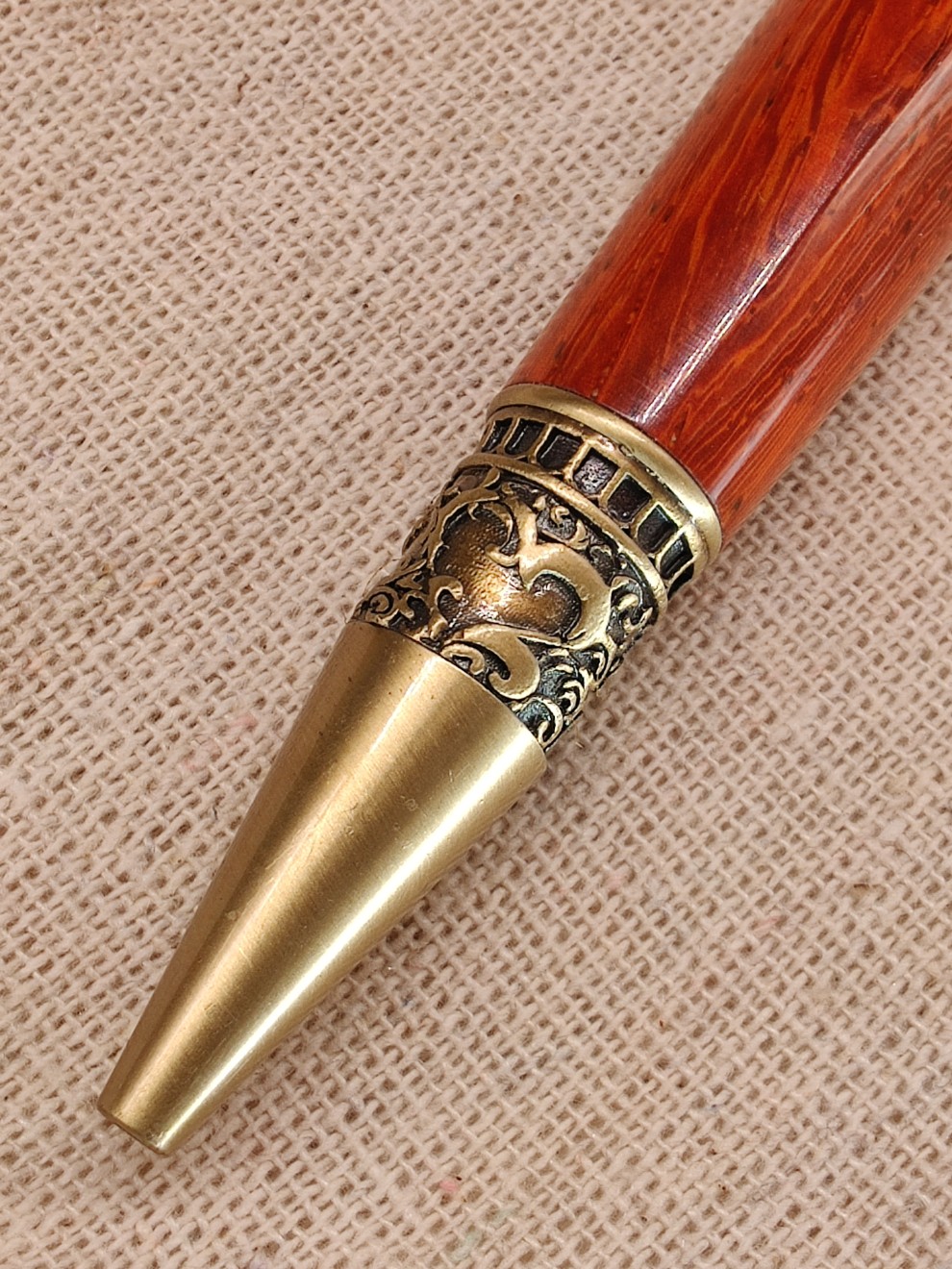 Le Serment Ardent est une invitation à la correspondance amoureuse. Ce stylo marie l'exubérance naturelle du bois de Padouk à l'élégance intemporelle du laiton vieilli.