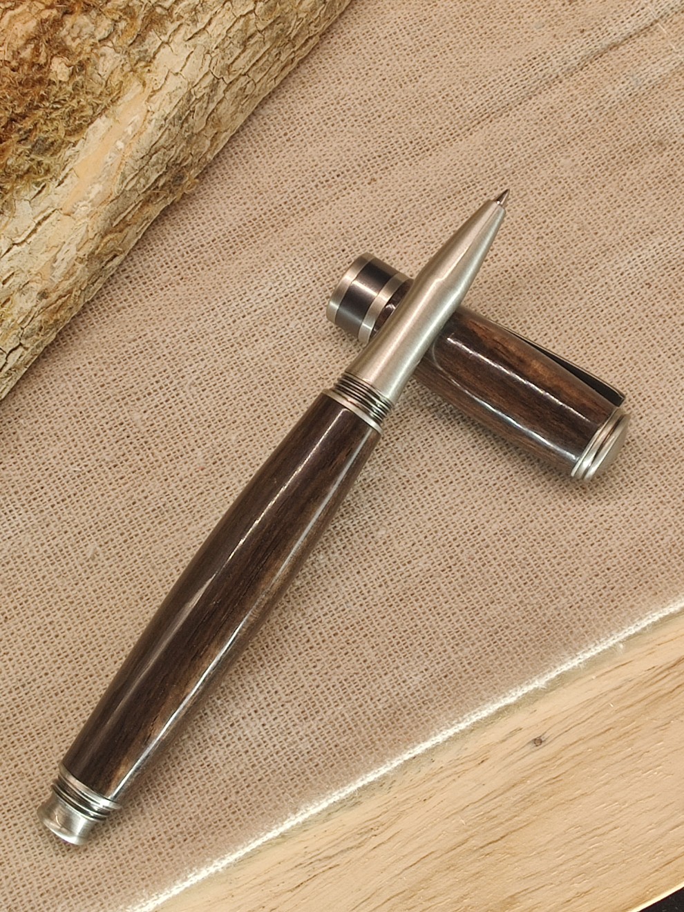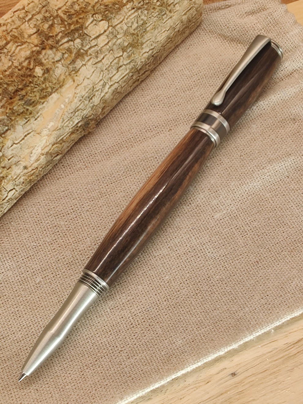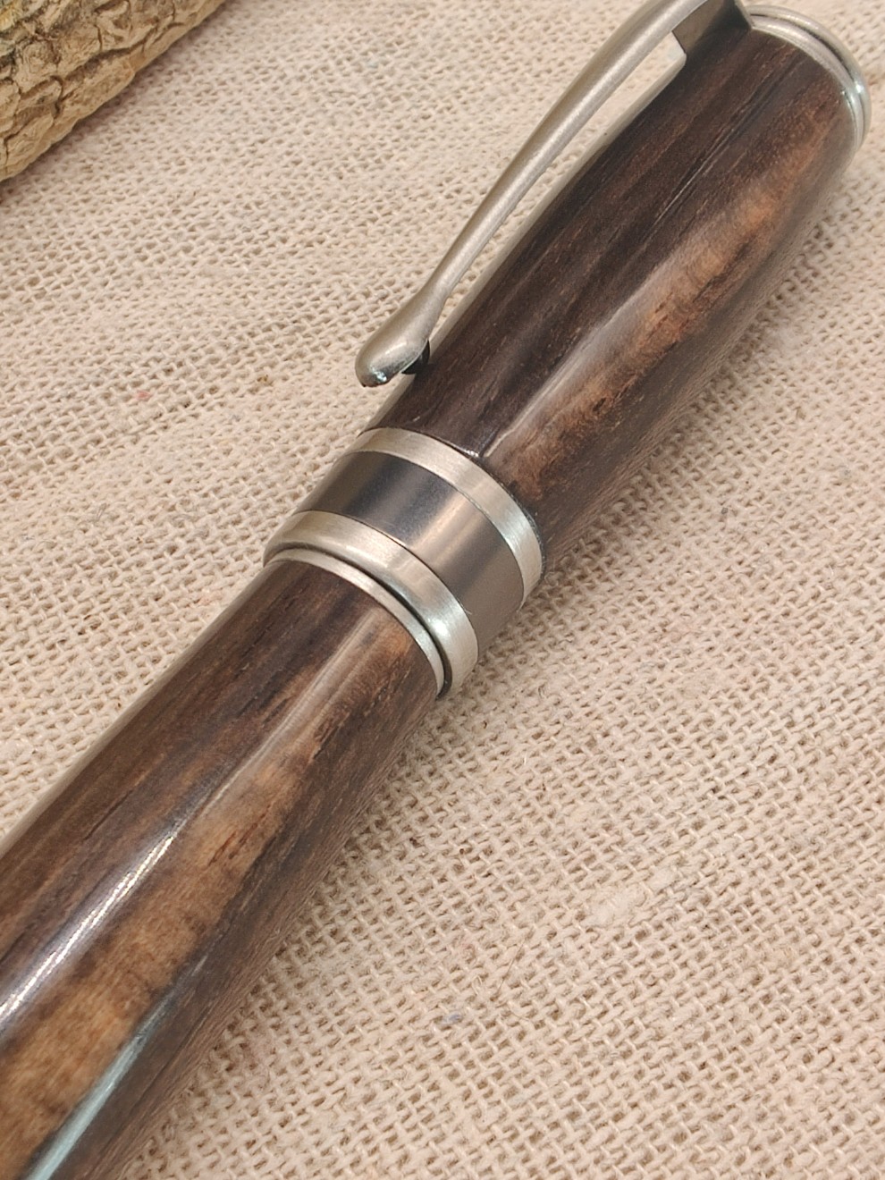 Bois Exotique Rare : Le corps est tourné dans l'exceptionnel Ébène de Macassar. Ce bois précieux, lourd et durable, présente une couleur brun-noir profond et intense, avec de subtiles variations de teintes. Son aspect est sombre et élégant, conférant à chaque stylo une présence remarquable.