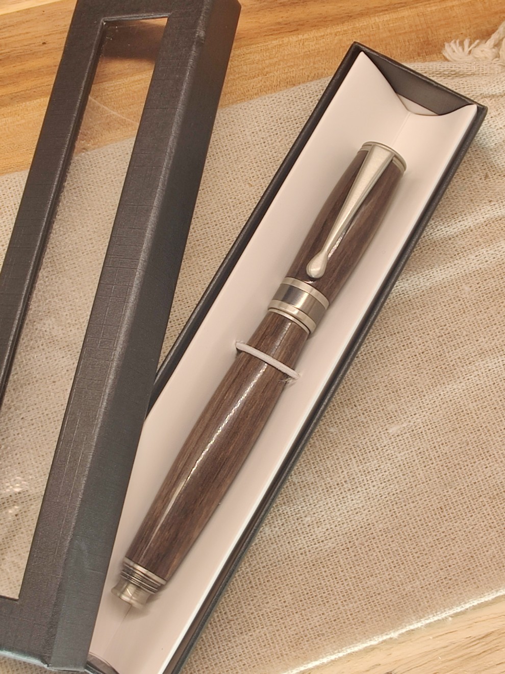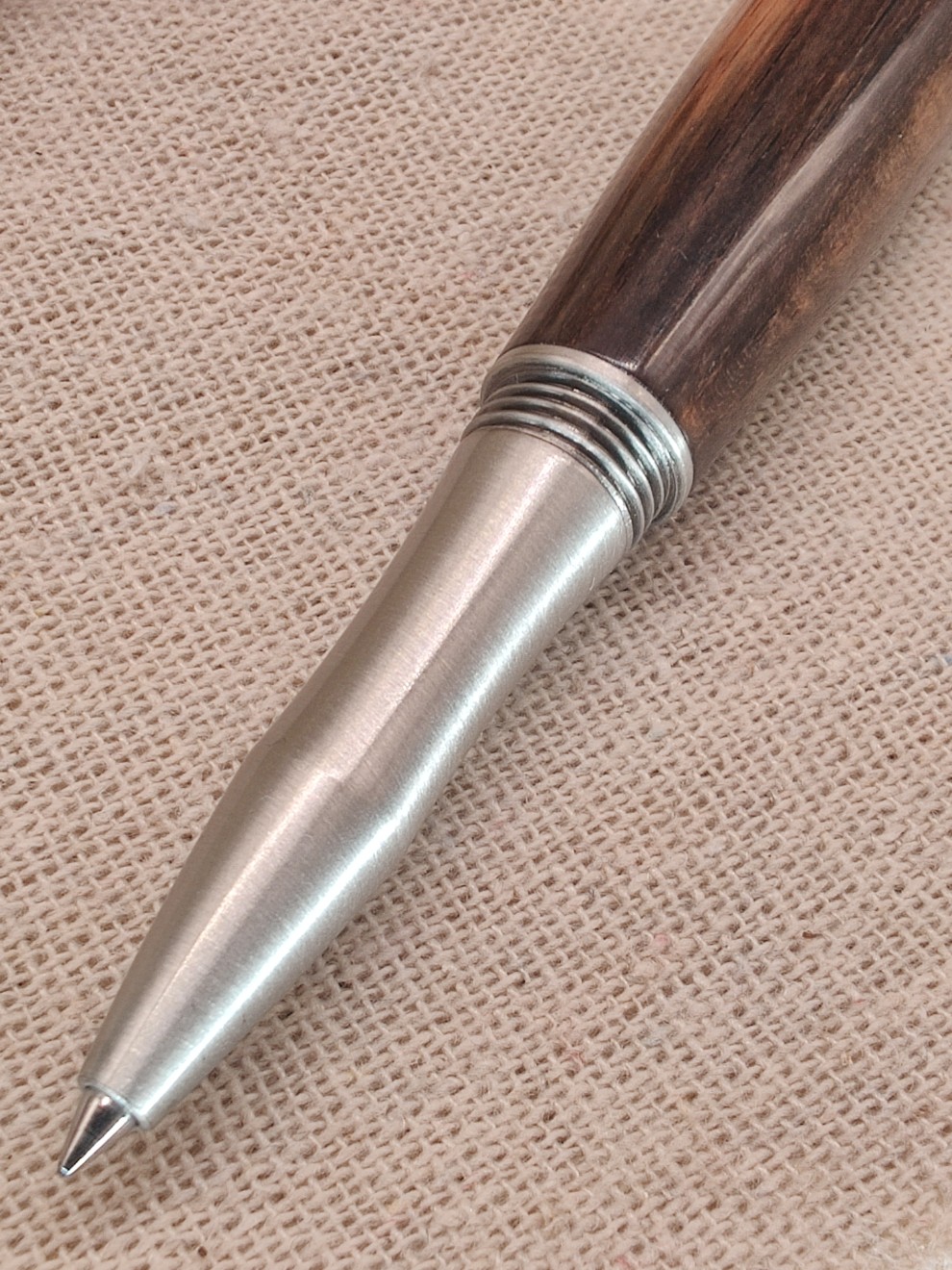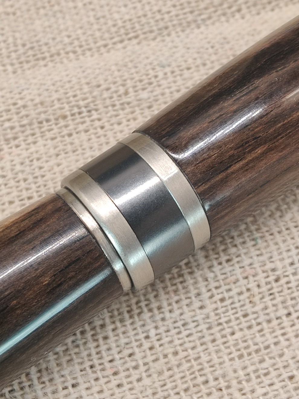 Bois Exotique Rare : Le corps est tourné dans l'exceptionnel Ébène de Macassar. Ce bois précieux, lourd et durable, présente une couleur brun-noir profond et intense, avec de subtiles variations de teintes. Son aspect est sombre et élégant, conférant à chaque stylo une présence remarquable.